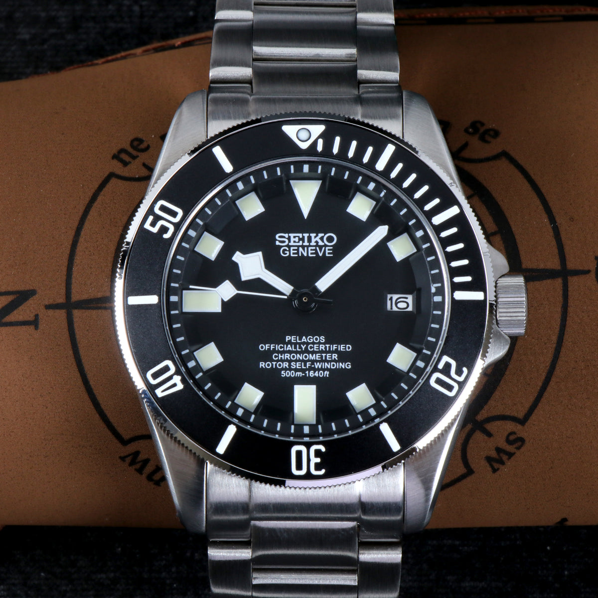The Custom Vintage Tud-Style Mod Watch is a mechanical automatic wristwatch designed in a classic dive-style aesthetic. It features a stainless steel case, a black dial with high-contrast markers, and a unidirectional rotating bezel for time tracking. The watch is powered by an NH35 automatic movement and does not require a battery.